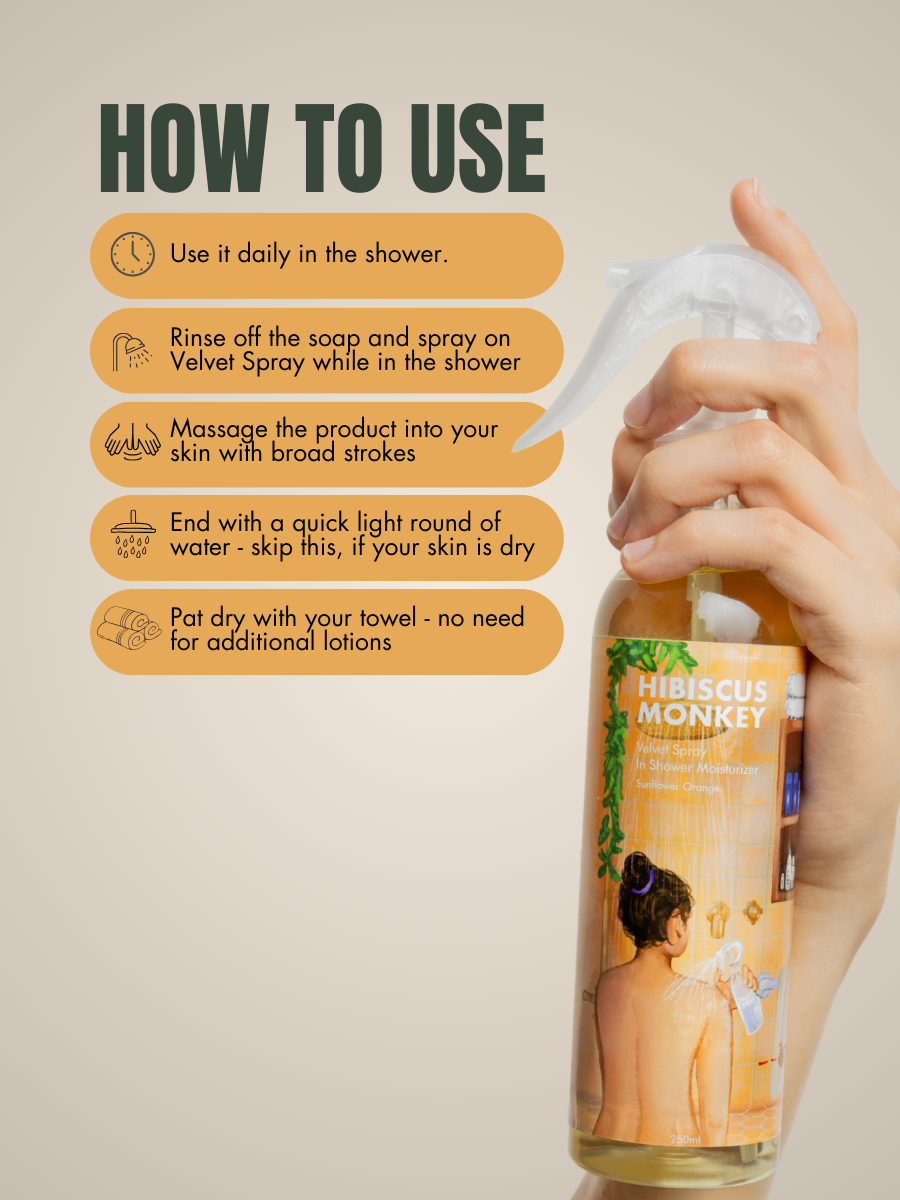 Velvet Spray is the ultimate body moisturizer for dry skin! It is an in-shower moisturizer. Yes, Velvet Spray works by sealing in moisture in your skin while it is still wet in the shower, deeply hydrating your body.